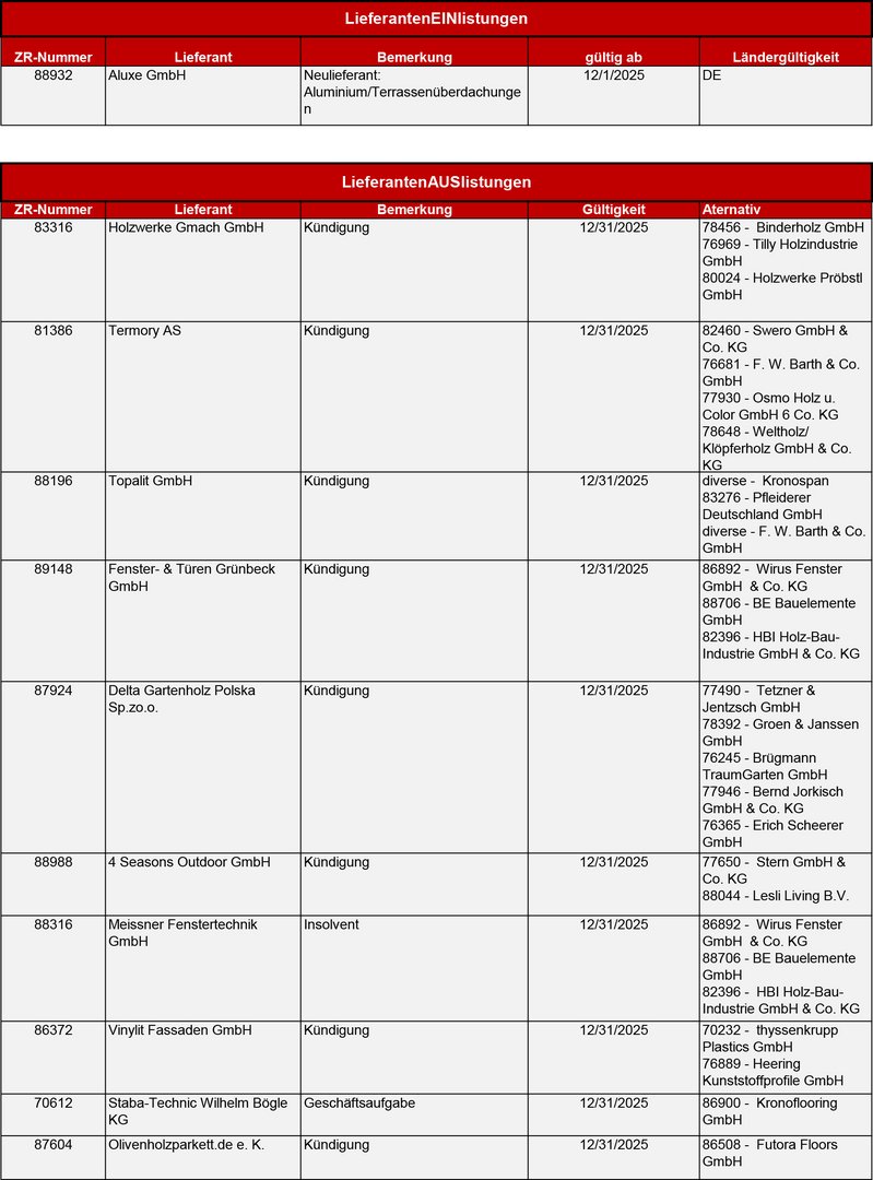 Folgend erhalten Sie die kompletten LieferantenEIN- und AUSlistungen Januar 2026.